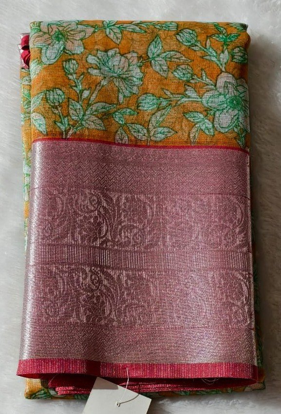 Mustard Bloom Floral Silk Saree with Rose Pink Zari Border