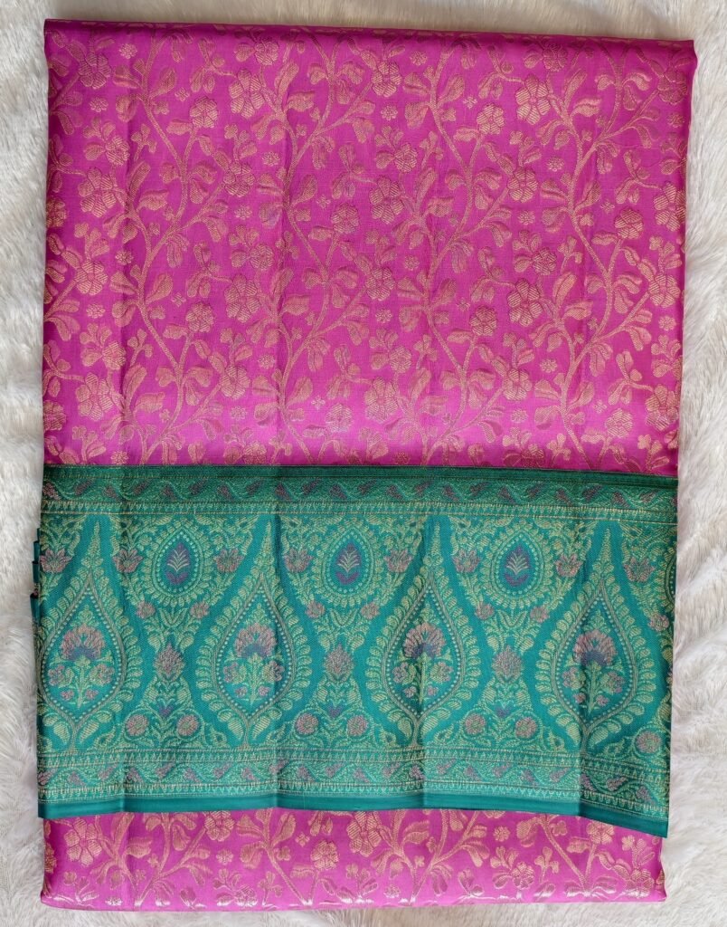 • Appears to be a pure Resham saree (likely Kanchipuram style), known for its rich texture and durability.