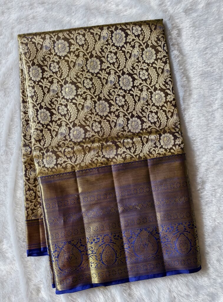 The body features a deep chocolate brown shade with a beautiful golden zari overlay.