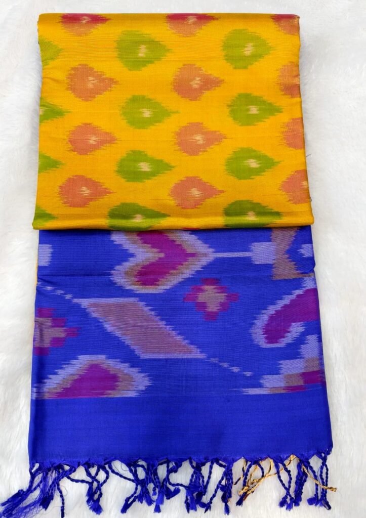 Elegent soft pure resham pochampally lightweight saree with yellow and royalblue combination