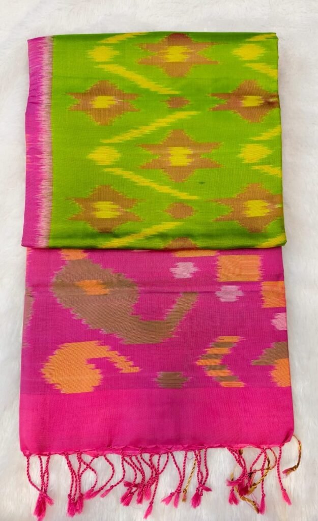 Purchase & earn 100 points!This saree appears to be a vibrant soft pure resham pochampally silk saree, known for its distinctive blurred, geometric patterns created through a resist-dyeing technique.
